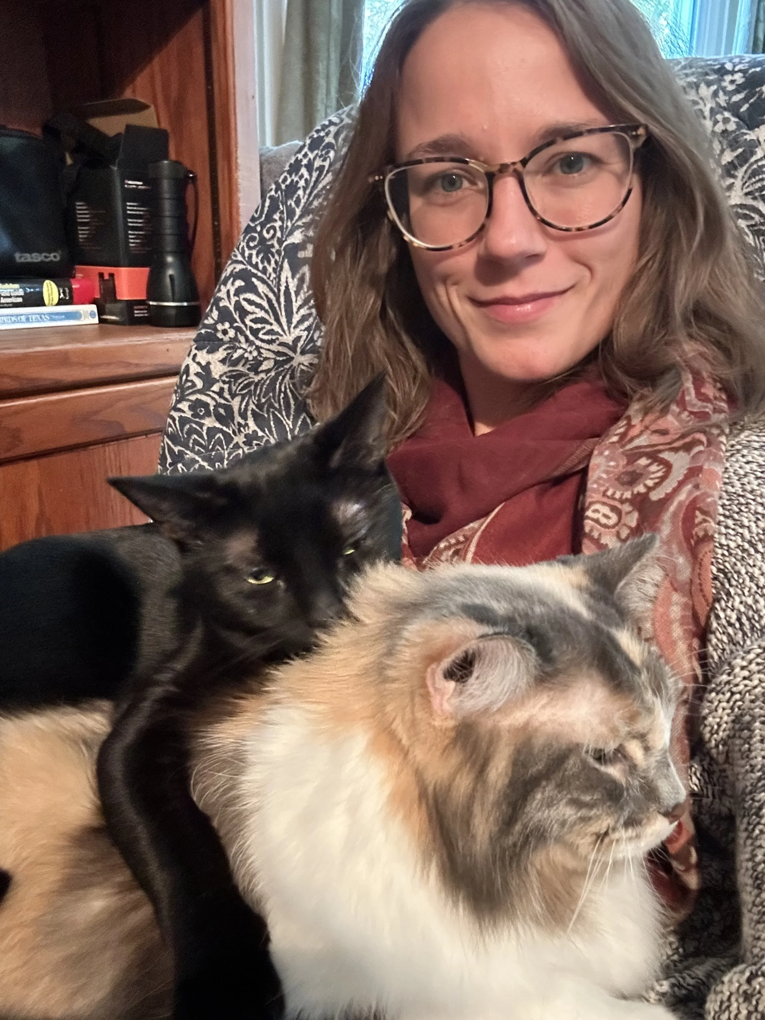 Outside of work, I find joy in the small things: reading (currently halfway through The Wheel of Time), painting, hiking, being near water and lying out in the sun, open mics, shared meals, and cozy nights with friends. I live with two very opinionated cats, Opal and Shadow, who do their part to keep things weird and playful!